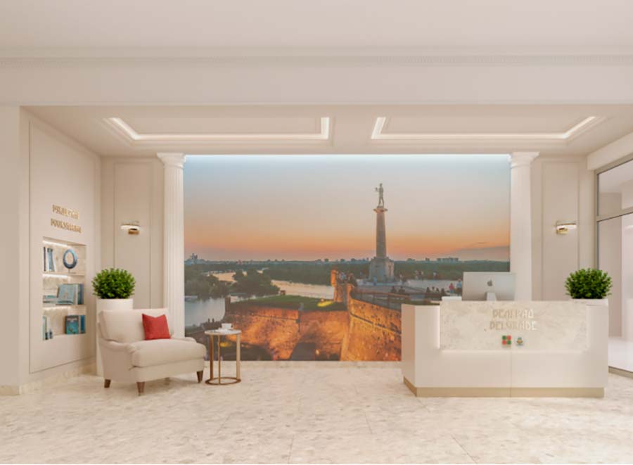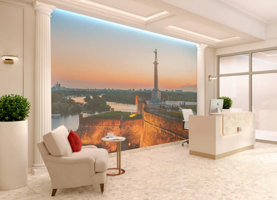 Дизайнерское лобби в доме «Белград». Вашему взгляду откроется красивая картина: в лучах заката сияет одна из главных достопримечательностей столицы Сербии — памятник Победителю, расположенный в парке Калемегдан рядом с Белградской крепостью, омываемой водами Савы и прекрасного Дуная.