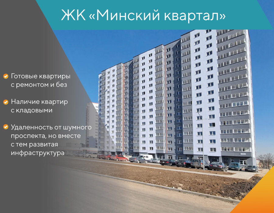 ЖК «Минский квартал» расположен в Московском районе Минска, в границах ул. Грушевская − пер. 1-й Железнодорожный − ул. Разинская − пер. Разинский − пер. Зенитный. Дома готовы. И на сегодня можно прибрести квартиры в доме по ул. Грушевская, 21. В продаже 1, 2, 3-комнатные квартиры (также 3-комнатные квартиры можно приобрести вместе с кладовой на цокольном этаже). Цены — от 2 935 BYN за кв. м. Рассрочка до 24 месяцев без изменения цены. Кредит от ОАО «Белинвестбанк» от 11,87% годовых и кредит от ОАО «АСБ Беларусбанк» от 23% годовых.
