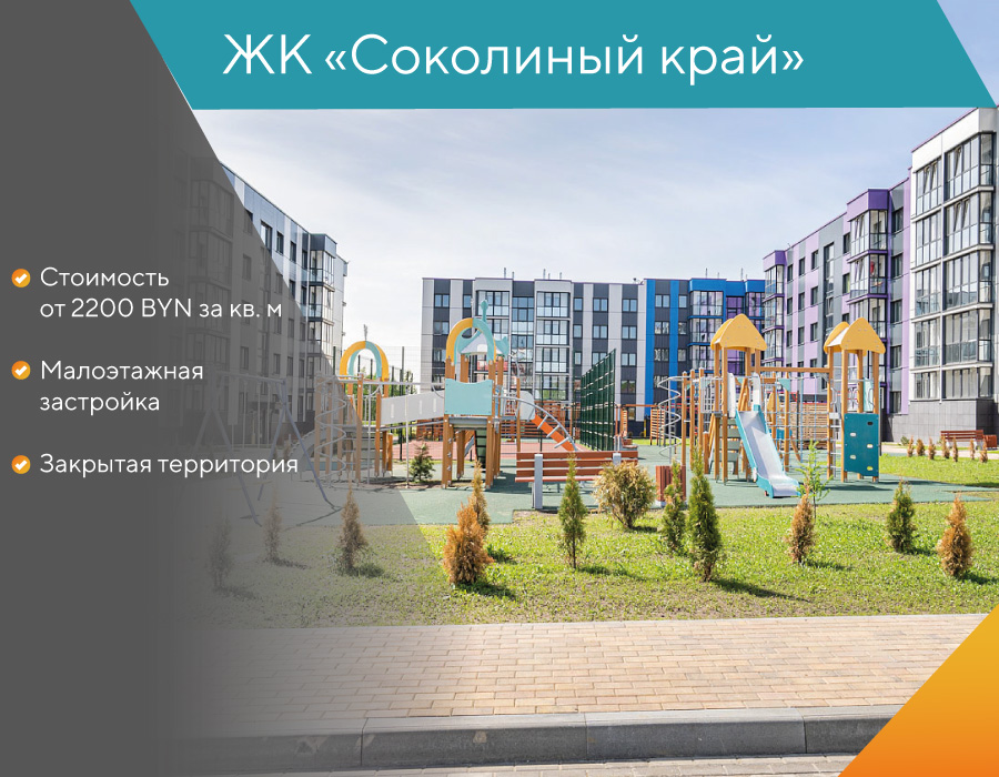 ЖК «Соколиный край» находится в 15 км от Минска (ст. м. «Слуцкий Гостинец»). Добраться до комплекса можно на автомобиле (10 минут до МКАД), на маршрутке, автобусе, электричке (30 минут до железнодорожного вокзала «Минск-Пассажирский»). В продаже квартиры-студии, 1, 2, 3-комнатные квартиры. Цены — от 2 200 BYN за кв. м. Рассрочка до января 2023 г. Кредит от ОАО «АСБ Беларусбанк» от 12% сроком до 20 лет.