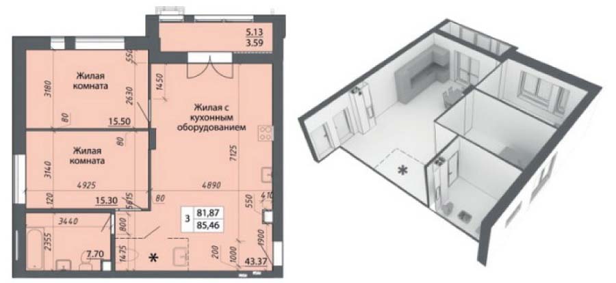 3-комнатные квартиры площадью от 85,04 кв. м. Старая цена 2 750 BYN за кв. м (233 860 BYN). Цена со скидкой 2 200 BYN за кв. м (187 088 BYN). Скидка за квартиру составляет 46 772 BYN.