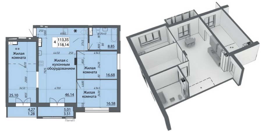 4-комнатные квартиры площадью от 118,14 кв. м. Старая цена 2 750 BYN за кв. м (324 885 BYN). Цена со скидкой 2 200 BYN за кв. м (259 908 BYN). Скидка за квартиру составляет 64 977 BYN.