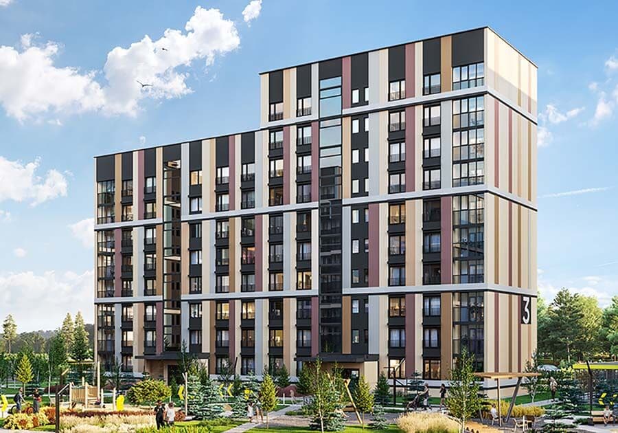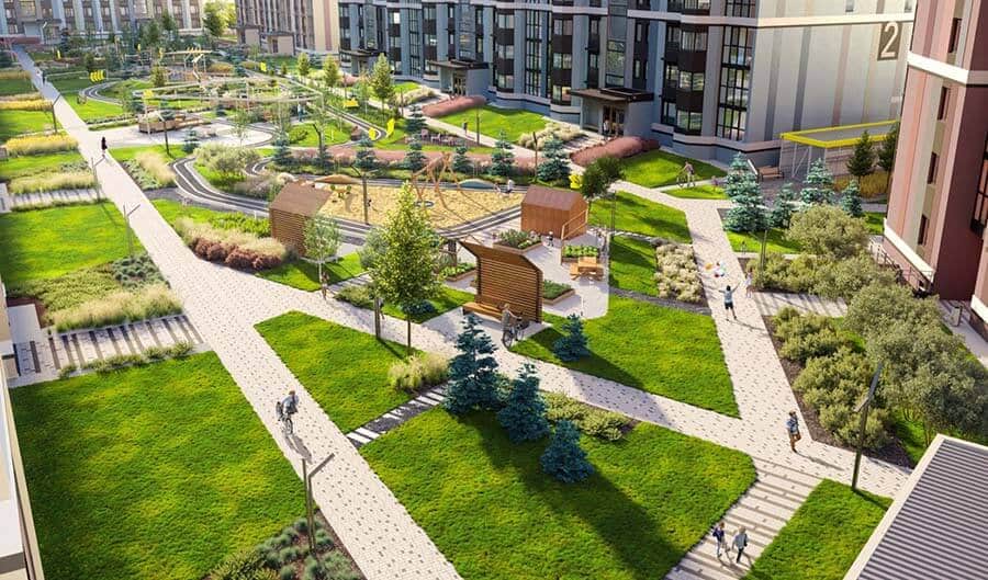 Фасады домов давно стали визитной карточкой комплекса. Каждый квартал здесь имеет свой стиль и узнаваемость. Фасады нового дома будут выполнены в песочной цветовой гамме. Подъезды будут проходными: с выходами на улицу и в закрытый двор. Там будут расположены детский трек со светящимися стрелками и знаками, игровые площадки, мини-огороды, зоны отдыха и велобоксы. Вход со стороны двора предусмотрен на уровне земли. Лифты, как и подъезды, будут сквозными.