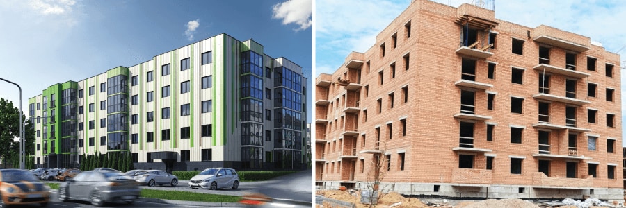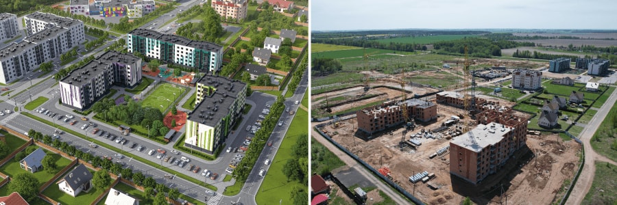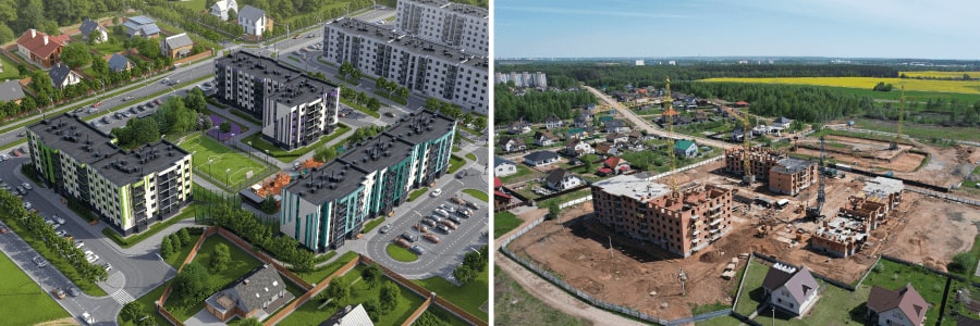 Давайте посмотрим, как на сегодняшний день выглядит строительство тех домов, которые представлены на рендерах.