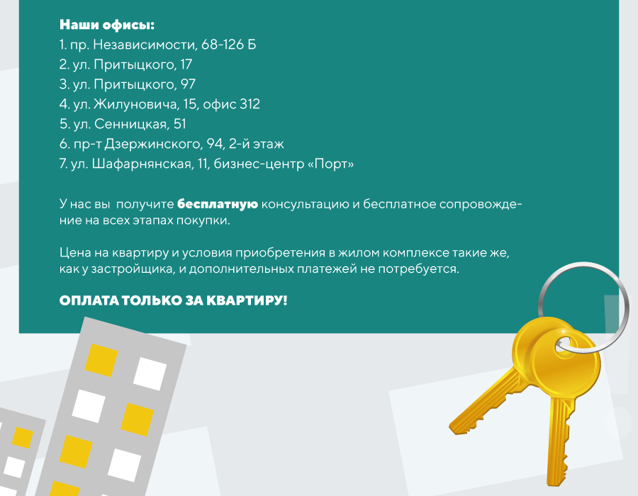 Какой именно вариант покупки квартиры в одном из проектов ОДО «Айрон» подойдет именно вам, можно узнать уже сегодня. Позвоните на +37517 336-77-30, +37529 371-01-01, напишите нам в онлайн-чат или просто зайдите в один из семи офисов. Расскажите о том, что Вы ищете, и мы предложим вам варианты решения.