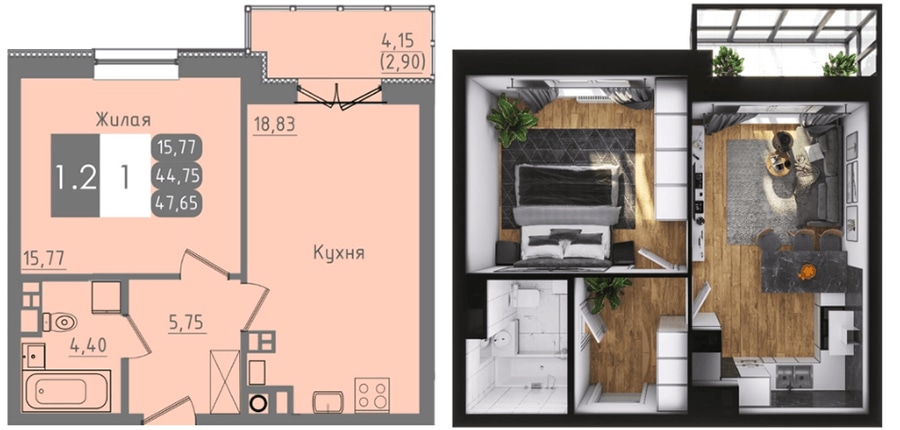 - 1-комнатная квартира общей площадью 47,65 кв. м., с просторной кухней-гостиной 18,83 кв. м. и отдельной спальней 15,77 кв. м. Цена 2 300 BYN за кв. м, стоимость квартиры 109 595 BYN (42 894 USD). Квартиру можно купить с привлечением кредита: специальная программа кредитования от ОАО «АСБ Беларусбанк» со ставкой от 10% годовых. При наличии собственных средств в размере 13 000 USD ежемесячный платеж составит от 375 BYN. Также возможна рассрочка.
