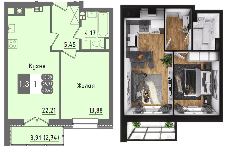 - 1-комнатная квартира общей площадью 48,45 кв. м., с просторной кухней-гостиной 22,21 кв. м. и отдельной спальней 13,88 кв. м. Цена 2 230 BYN за кв. м, стоимость квартиры 108 044 BYN (42 288 USD). Квартиру можно купить только за собственные средства, без привлечения кредита.