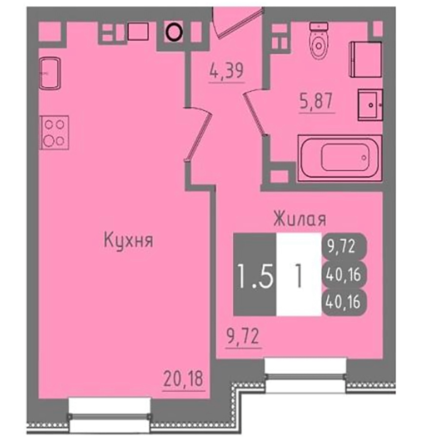 - 1-комнатная квартира общей площадью 40,16 кв. м., с просторной кухней-гостиной 20 кв. м. и отдельной спальней 9,72 кв. м. Цена 2 360 BYN за кв. м, стоимость квартиры 94 777 BYN (37094 USD). Квартиру можно купить только за собственные средства, без привлечения кредита.
