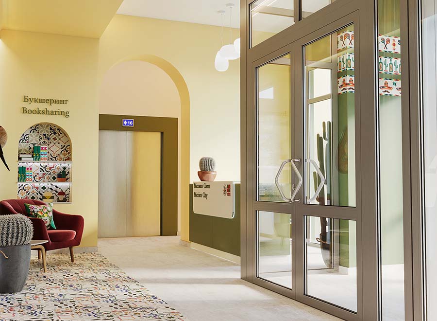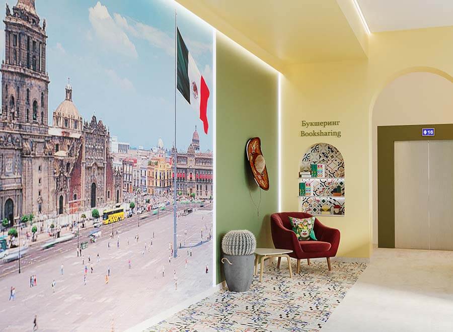 Вход в дом «Мехико-Сити» находится на уровне земли. Его предварят красивые цветочницы и скамейки для отдыха. Здесь обустроят вело- и автопарковки. Минск Мир — безбарьерная среда, где будет удобно маломобильной части населения, а также родителям с колясками! Открыв двери дома, мы окажемся в красивом и просторном вестибюле, одну из стен которого украсит изображение легендарной Площади Конституции в Мехико. Здесь находится стойка для приветливого консьержа, присутствие которого многократно повышает уровень безопасности в доме. Предусмотрено место отдыха для гостей и туалетная комната с пеленальным столиком (комфорт для мам и малышей).