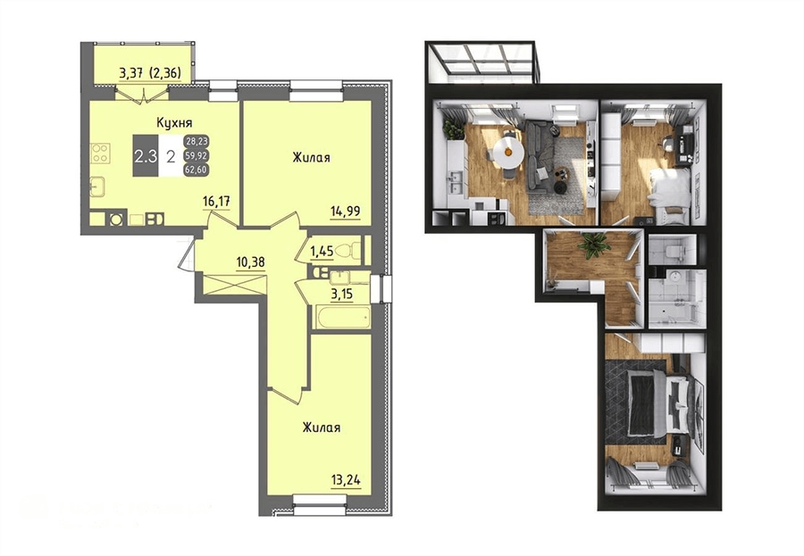 - 2-комнатная квартира (евротрешка) площадью 63–67 кв. м с кухней-гостиной до 25 кв. м и двумя комнатами;