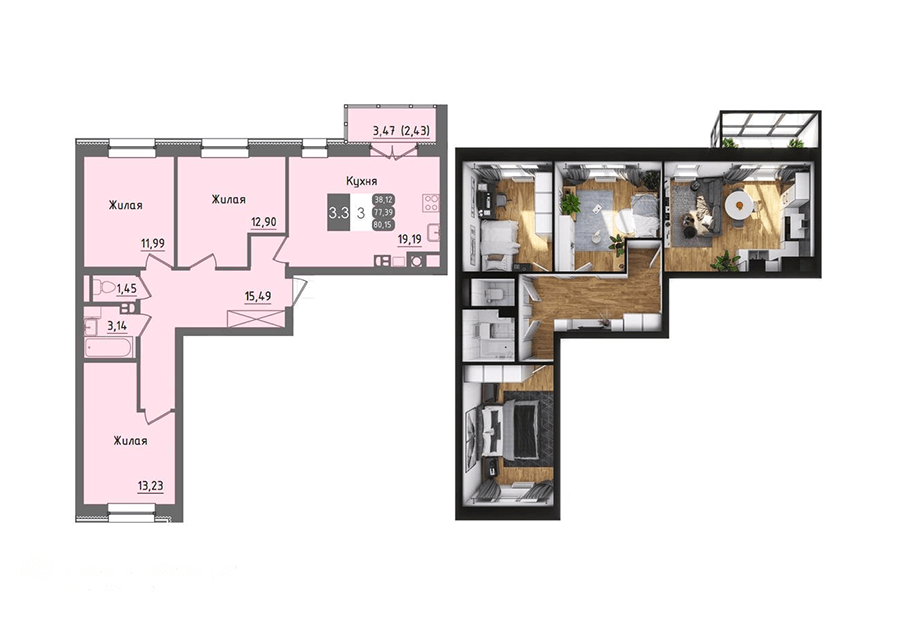 - 3-комнатная квартира (еврочетырешка) площадью от 80 кв. м с кухней-гостиной до 20 кв. м и тремя комнатами.
