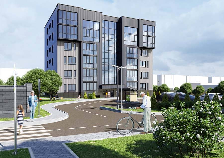 Конструктивная схема шестиэтажки — монолитно-каркасная. Наружные стены выполнены из керамических блоков, межквартирные — из кирпича, а перегородки — из гипсовых блоков. Вентилируемый фасад покрыт линеарными панелями и отличается приличным объемом остекления, в том числе витражного.