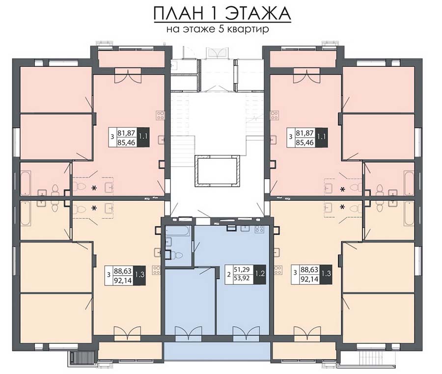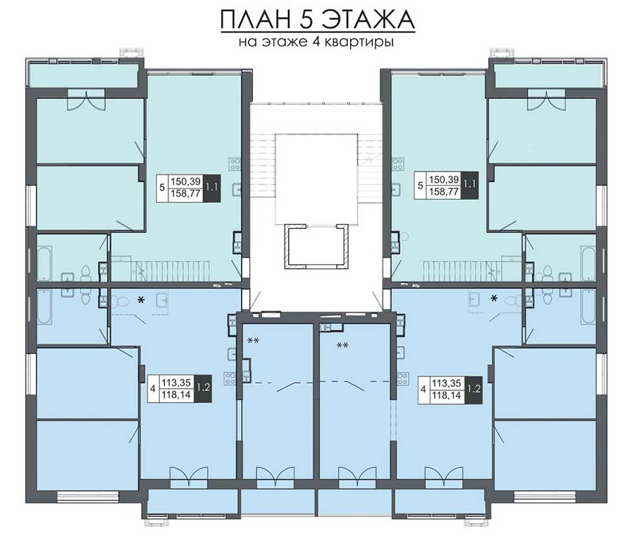Здание состоит всего из одного подъезда и рассчитано на 26 квартир. На выбор — двушки, трешки, четырешки, а также двухуровневые пентхаусы на верхнем этаже, состоящие из пяти комнат. Планировка у жилья для современного человека привычная: кухня объединена с гостиной, санузел совмещенный, остальные помещения выделены из общего пространства перегородками. Площадь варьируется от 53,49 м до 118,14.