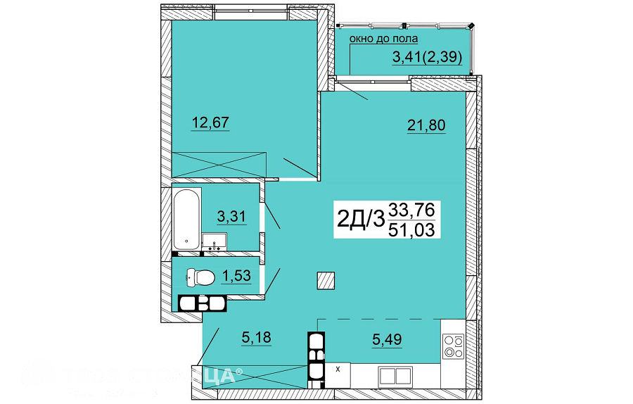 2-комнатная квартира: снова правильная прямоугольная форма, просторная кухня-гостиная 27 кв. м с панорамным окном у входа на лоджию, раздельный санузел.