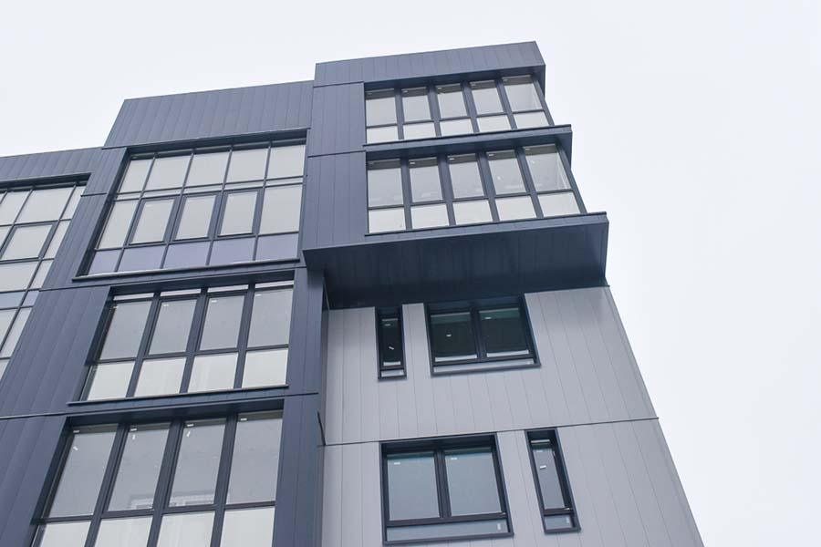 Наружные стены жилого дома выполнены из керамического блока, внутренние стены — из кирпича. Конструктивная схема — монолитно-каркасная. Фасад дома выполнен из линеарных панелей (вентилируемый фасад) и декоративного кирпича, которые не выцветают и не теряют цвет.