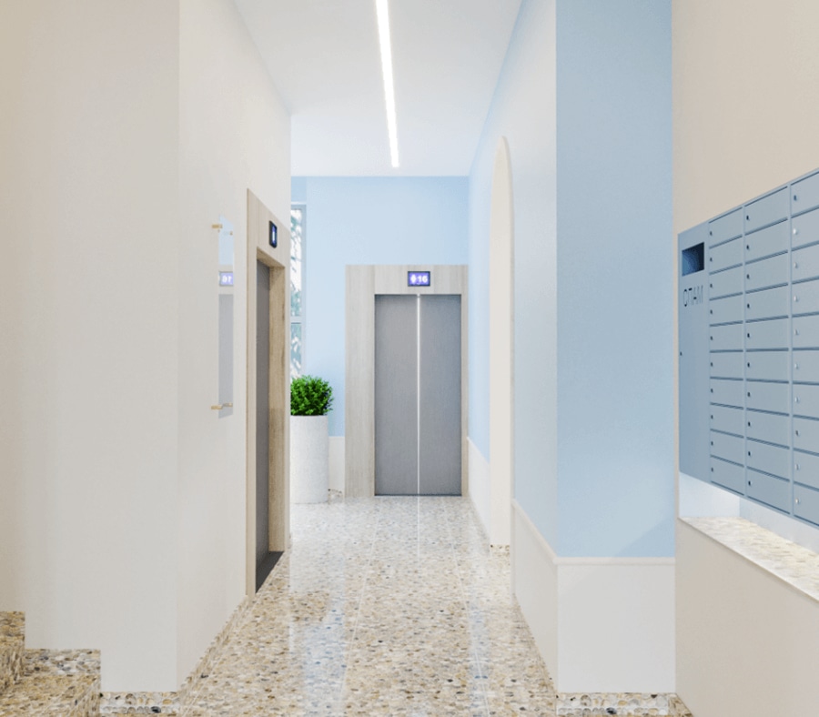 Дом «Панама-Сити» встречает просторным вестибюлем. Внутри рабочее место консьержа, в разы повышающего безопасность и благоустроенность общественного пространства.