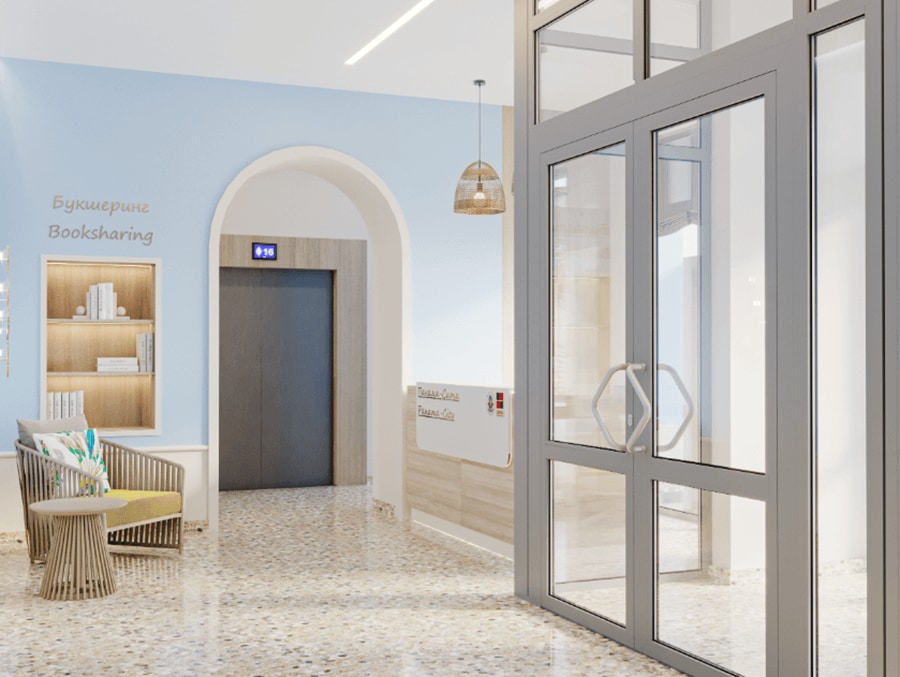 Рядом место отдыха для гостей и букшеринг — небольшая библиотека общего пользования. Будет обустроена санитарная комната с пеленальным столиком. Фойе украсит живописная картина Панама-Сити — города во Флориде (США), в честь которого названа эта новостройка.
