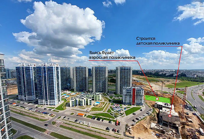 В квартале Северная Европа (где дом Хельсинки) в данный момент одновременно строятся два учреждения здравоохранения – детская и взрослая поликлиники.