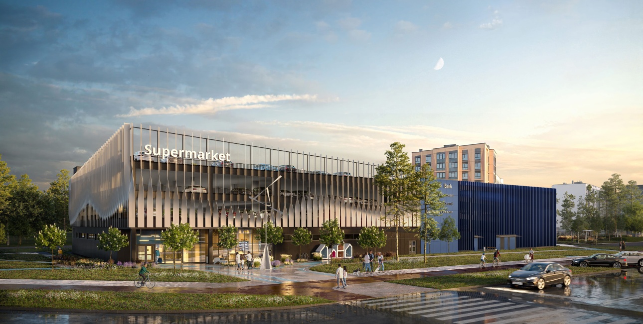 Рядом с домом появится первый паркинг квартала (дом 14.12 по генплану) с супермаркетом и коммерческими объектами. У входа — домики для собак, где можно оставить питомца на время покупок. Паркинг будет оформлен в авиационной стилистике — с металлическими ламелями в форме винтов.
