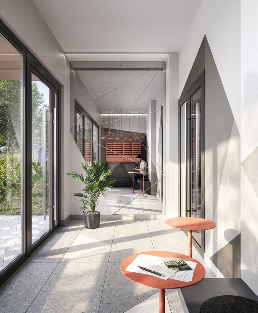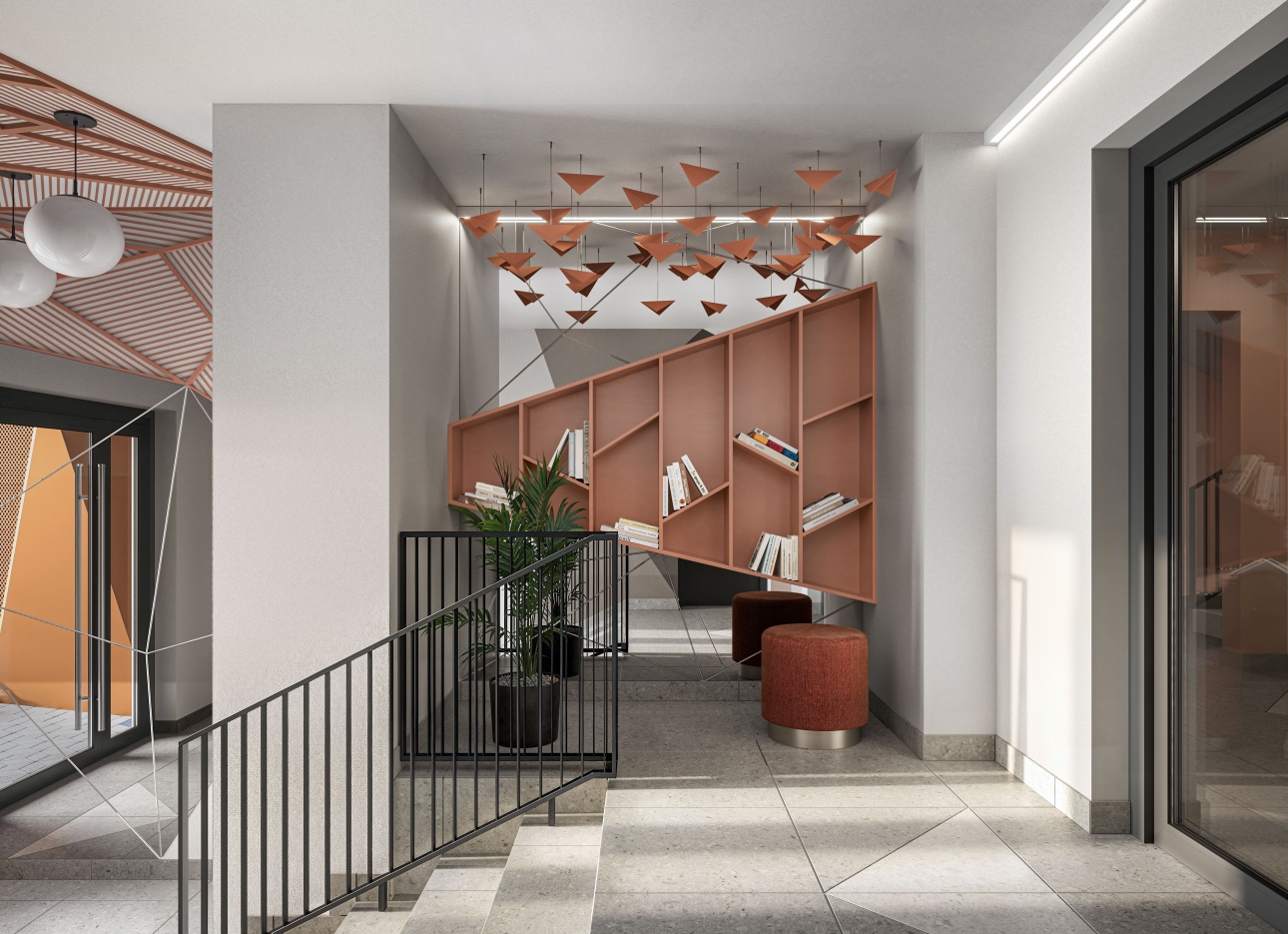 Подъезды украсят декоративные элементы в технике оригами, зеркала и «летающие» самолётики, реагирующие на движение воздуха. Входы — безбарьерные, с остеклёнными дверями. На этажах — колясочные, на первых уровнях — лапомойки и велобокс.