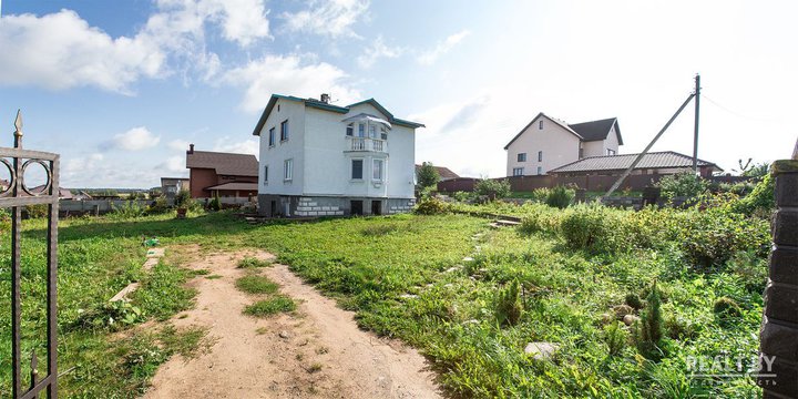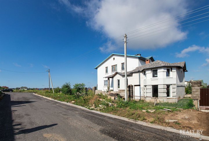 В д. Семково на продажу выставлен 4-этажный коттедж. Вместе с агентом мы прогулялись по объекту недвижимости. К коттеджу ведет асфальтированная дорога, большинство домов рядом жилые, напротив ведется строительство еще одного дома. В выставленном на продажу коттедже давно никто не живет, потому территория участка несколько заросла.