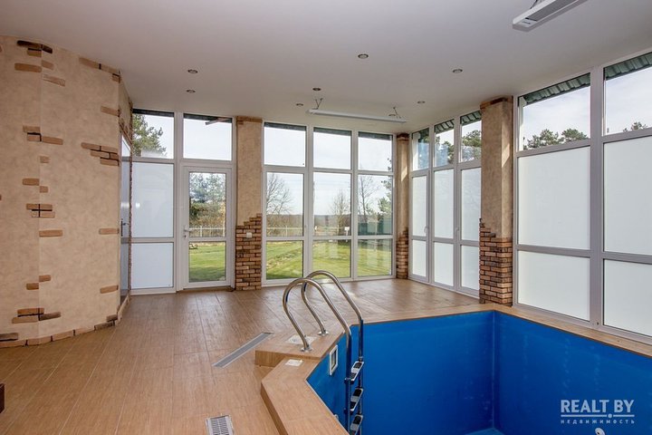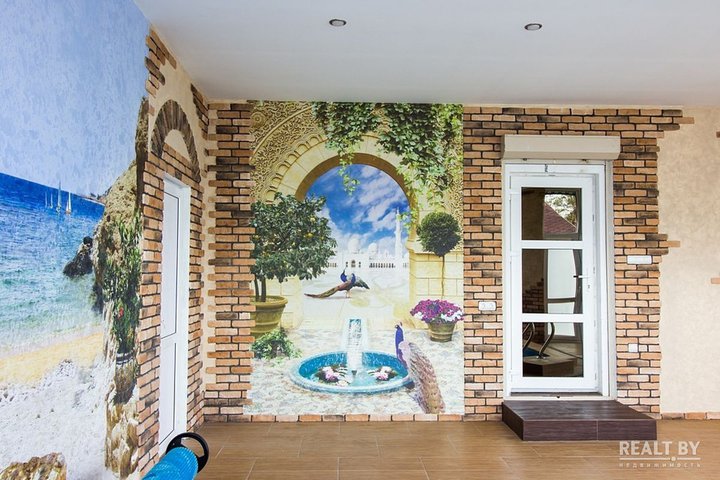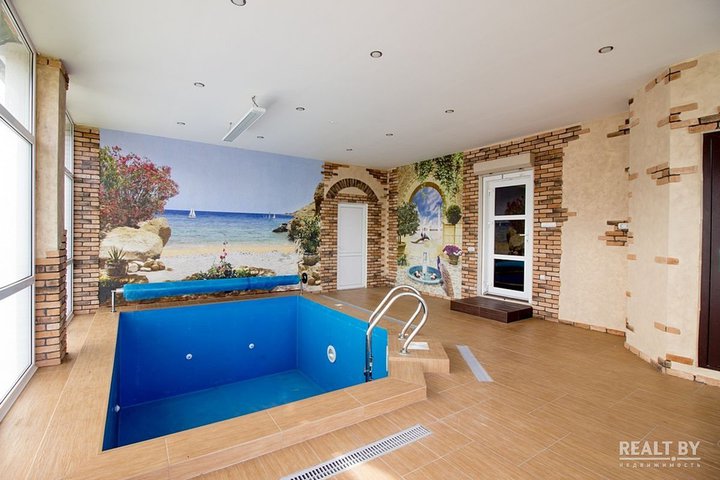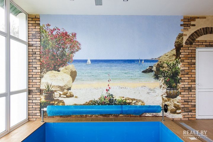 Бассейн с системой фильтрации размещается в просторном помещении, две стены которого имеют панорамное остекление с видом на сад, оставшиеся украшает изысканная фреска.