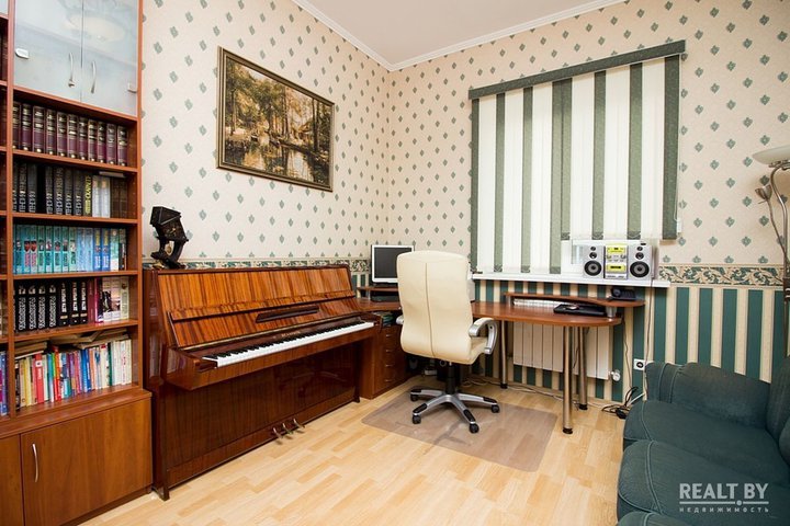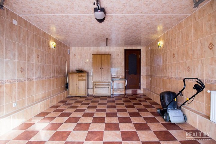 Общая площадь трехуровневого коттеджа — 411,5 кв.м. Дом построен из газосиликатных блоков, утеплен минватой, оштукатурен и окрашен. Кровля — натуральная черепица, на окнах — деревянные стеклопакеты высокого качества. Покрытие пола — ламинат, в санузлах — керамическая плитка с подогревом. Единовременно в коттедже возможно автономное проживание двух семей — в доме два отдельных входа, две кухни, девять комнат и пять санузлов.