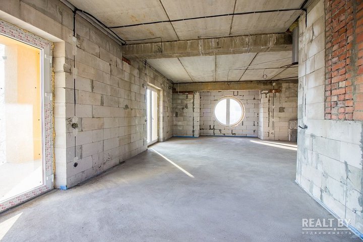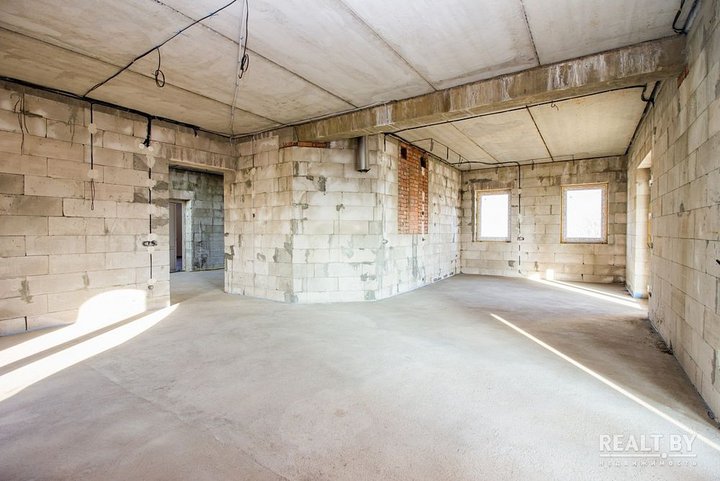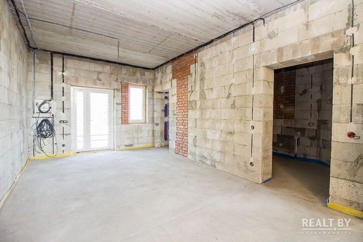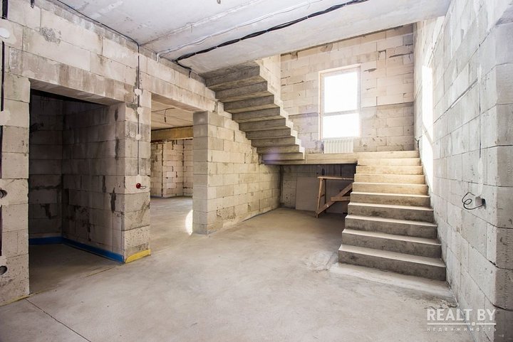 Первый этаж занимает просторная комната с чистовой отделкой и помещения без отделки: санузел, кухня и гостиная с выходом на террасу.