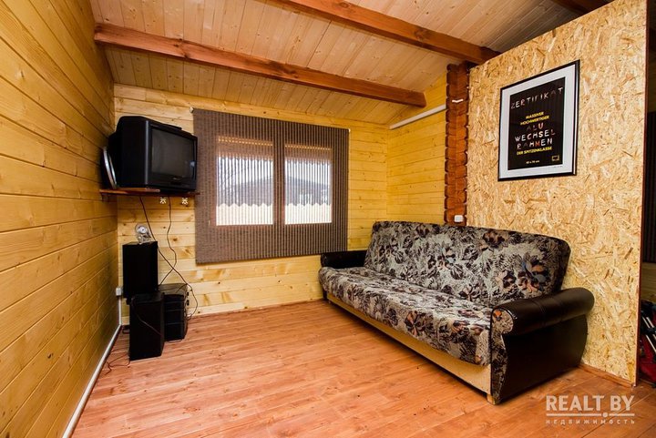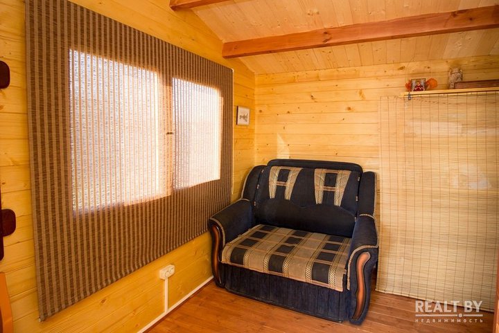 Своеобразный теремок в большинстве своем выполнен из натуральных материалов — в доме дощатые полы, отделка и снаружи, и внутри выполнена из дерева, на окнах деревянные рамы. В доме организованы две комнаты и открытая веранда. Канализация местная, вода есть, а вот газа пока нет.