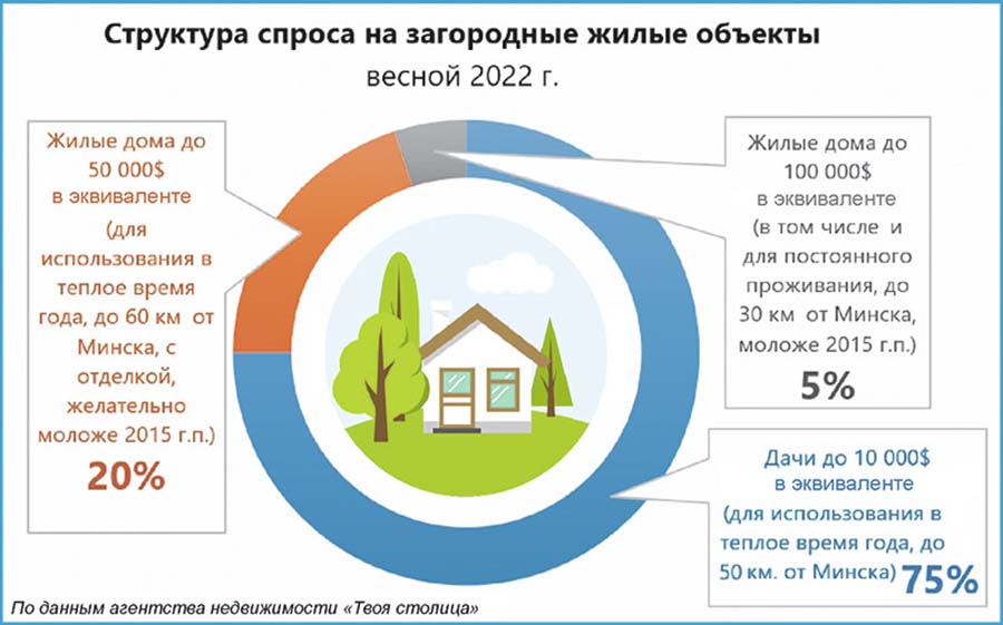 — Но чем ближе к Минску, тем дороже, поэтому по факту мы говорим о 15—25 километрах. Что касается стоимости объектов, которую готов заплатить в большинстве своем покупатель, то она относительно небольшая, ведь дачи чаще всего нужны только для проживания в теплое время года. Так что на первом месте запросов небольшие каркасные домики, срубы с печным отоплением до 10 тысяч долларов в эквиваленте. На втором месте — щитовые домики, где нет печного отопления, ценой до 6—7 тысяч долларов. На третьем месте сразу два типа запросов. Первый — ухоженные деревенские дома в хорошем состоянии с большим участком, где можно уединиться от посторонних глаз. Плюс к деревням постоянно чистят дороги, в большинстве случаев они асфальтированные, есть возможность доступа круглый год в отличие от дач в различных товариществах. Да и наличие небольшого магазина или регулярной автолавки в глубинке тоже играет свою роль. При этом никаких членских взносов и высоких тарифов за коммунальные услуги. Второй тип запросов — капитальные дома с возможностью круглогодичного проживания. Зачастую рядом на участке располагается баня, другие постройки. Стоимость подобных объектов стартует от 15 тысяч долларов в эквиваленте, — рассказывает Андрей Чернышев. — В приоритете у тех, кто настроен переехать за город или бывать там довольно часто, — одноэтажные дома или двухэтажные со скатной крышей площадью до 100 квадратных метров, которым 3—5 лет. За это время косяки либо уже успели проявиться и заметны, либо их уже исправили. Стоят такие варианты от 70 тысяч долларов в эквиваленте. При этом предложение таких объектов снижается. Так, по Минску с начала года по сравнению с аналогичным периодом прошлого на 30 процентов, по Минскому району — на 19 процентов, по Минской области — на 21 процент. По какой причине и сохранится ли тенденция, мы сможем сказать не раньше осени.
