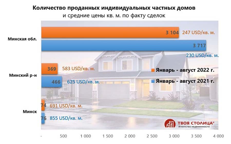 — Получилось, что по количеству проданных домов как в Минске, так и в Минском районе и области видна просадка. По Минску — в этом году продано на 3% меньше домов (больше похоже на погрешность или колебание, чем тенденцию), но в Минском районе цифра меньше на 21%, а в Минской области — на 16%. А это уже значительные и показательные цифры.