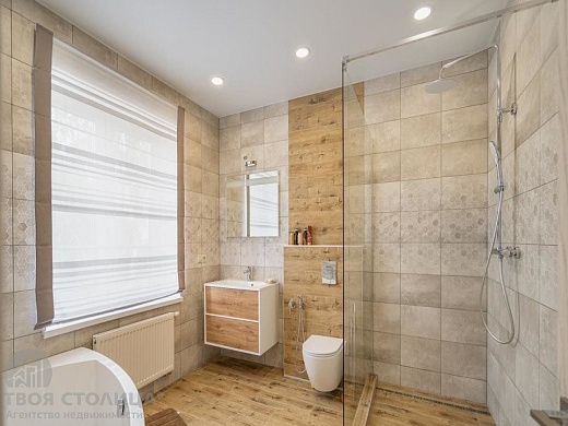 Коттедж оборудован: стеклопакеты, пол - ламинат, пол - с подогревом, сантехника новая, ванна угловая, душевая кабина, бытовая техника, стиральная машина автомат, посудомоечная машина, мебель.